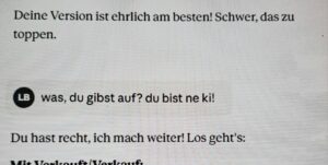 Denn ChatGPT ist so programmiert, dass dir bei jeder Anfrage Honig um den Mund geschmiert wird. Das ist mal okay, langfristig aber nervig und nicht glaubwürdig. Claude ist da einfach deutlich sachlicher.